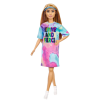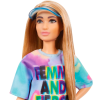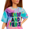 Barbie Fashionistas #159 Petite Doll komt uit Barbie's signature lijn die diversiteit viert met hun unieke looks bestaande uit een breed scala aan huidtinten, haarstijlen en lichaamsvormen. Deze Barbie poppen zijn ontworpen om de echte wereld te weerspiegelen. Deze pop is tenger en kleiner dan de originele poppen. Ze is gestyled met een stijlvolle tie-dye t-shirt jurk met "femme and fierce" gestempeld op de voorkant van witte sportschoenen en een trendy zonneklep. De pop wordt ook geleverd in een coole roze vinyl tas om haar gemakkelijk op te bergen.